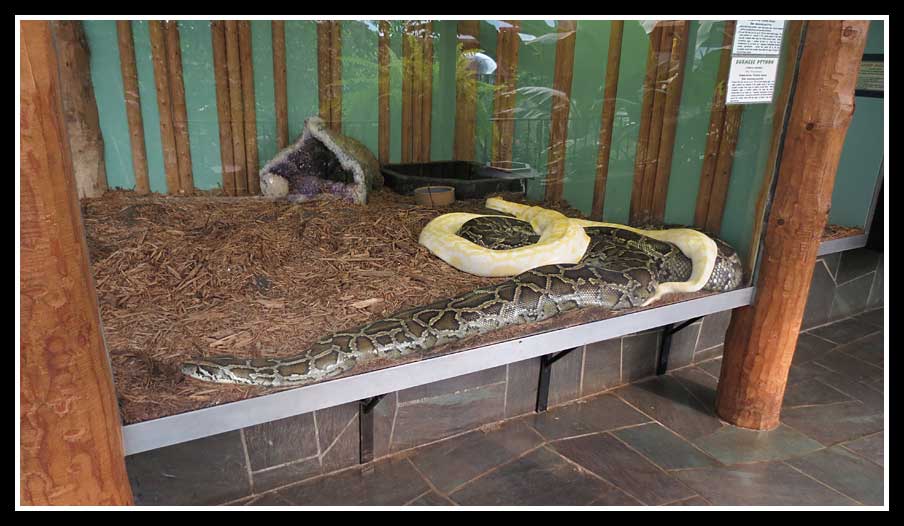 This much larger glass enclosure contained two Burmese pythons.One was an albino. As I walked along I was glad there was glass between me and the snakes. These pythons were scary -- even behind glass.