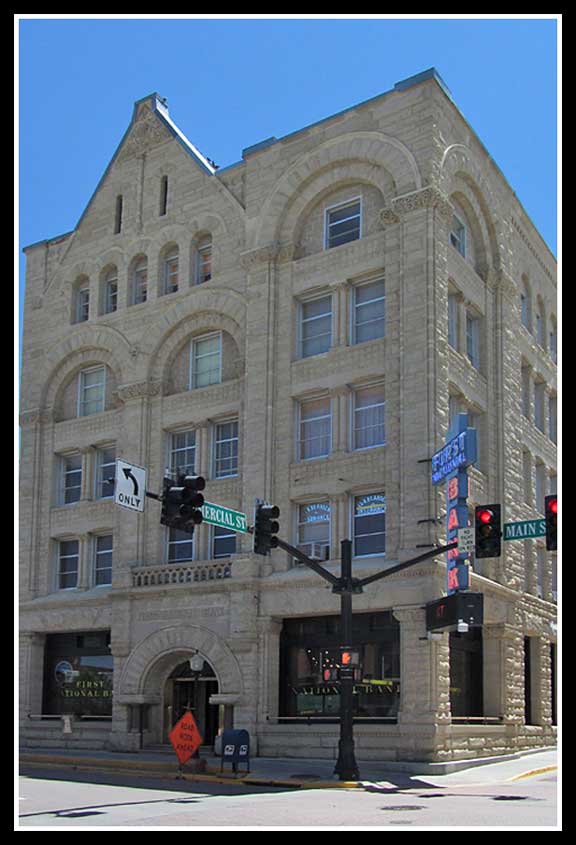 The First National Bank is a treasure that has survived intact from its initial construction in 1892. Three floors of quarried stone provide a very attractive building. (Today, commercial buildings appear to be built by cost accountants. Build a shell and attach a sign with the company logo. When time to sell, take the sign off.)
